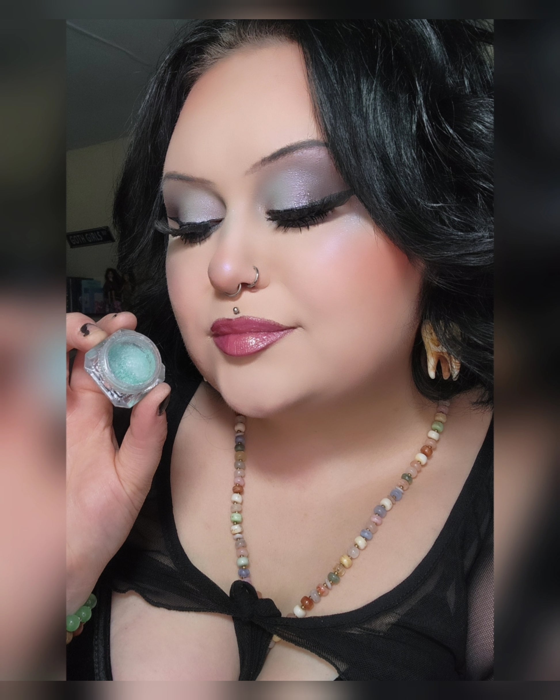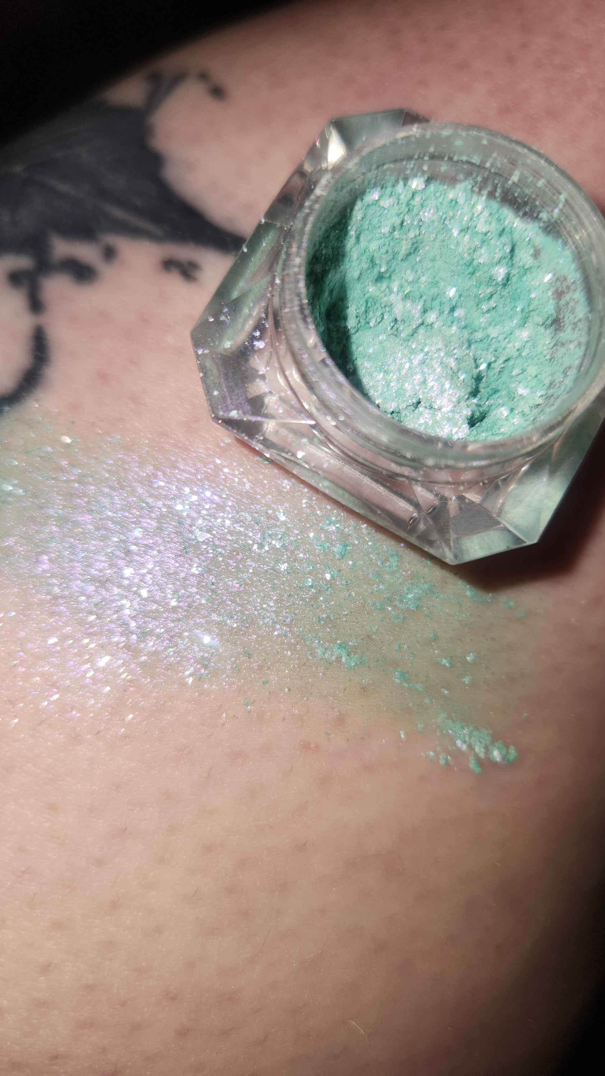 A stunning iridescent duochrome pigment that shifts from a frosty silver-blue to a soft lilac glow. This ultra-sparkly formula catches the light beautifully — perfect as an eyeshadow or a radiant highlighter.